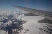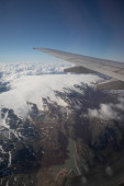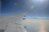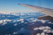 Piękny krajobraz aero z Morza Bałtyckiego, patrząc z okna samolotu małe pod skrzydła. Ryga, Łotwa, Europa w okresie letnim. Autentyczne doświadczenie latające w dzień słoneczny, zamglony. Powierzchni wody z odbicie słońca.