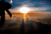 Piękny krajobraz aero z Morza Bałtyckiego, patrząc z okna samolotu małe pod skrzydła. Ryga, Łotwa, Europa w okresie letnim. Autentyczne doświadczenie latające w dzień słoneczny, zamglony. Powierzchni wody z odbicie słońca.