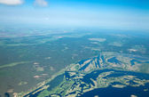 Piękny krajobraz aero, patrząc z okna samolotu małe pod skrzydła. Ryga, Łotwa, Europa w okresie letnim. Autentyczne doświadczenie latające w dzień słoneczny, zamglony. Krajobraz z powietrza.
