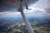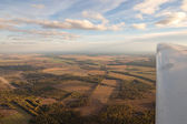 Piękny krajobraz aero, patrząc z okna samolotu małe pod skrzydła. Ryga, Łotwa, Europa w okresie letnim. Autentyczne doświadczenie latające w dzień słoneczny, zamglony. Krajobraz z powietrza.