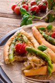 Chrupiące pitta z grillowanego mięsa, różnych warzyw i sosem czosnkowym na desce do krojenia
