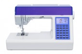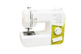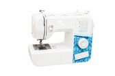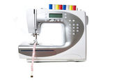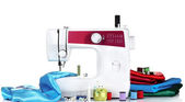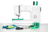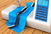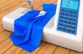 Nowoczesne elektroniczne maszyny do szycia z tkaniny na drewnianym stole. renderowania 3D