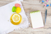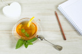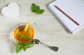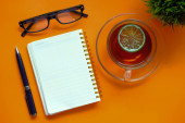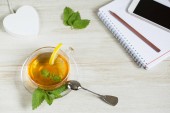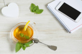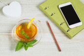 Zdjęcie "Koncepcja pracy dzień ochłoda: filiżanka herbaty ziołowe lipy na białym tle. Leżał z płaskim" może być wykorzystywane do celów osobistych i komercyjnych zgodnie z warunkami zakupionej licencji Royalty-free. Obraz jest dostępny do pobrania w jakości wysokiej rozdzielczości do 5760x3840.