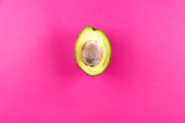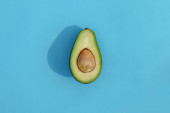 Z płaskim leżał awokado organiczne na jasne niebieskie tło. Widok z góry, miejsce.