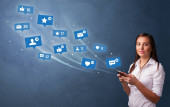 Pretty młoda dziewczyna trzyma telefon z ikonami mediów społecznościowych