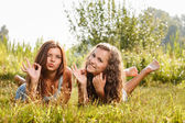 piękne dziewczyny bawią się w przyrodzie stoi ramię w ramię i uśmiechający się