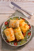 Gołąbki z mięsem, ryżem i warzywami. Nadziewane Gołąbki z mięsem. Chou farci, dolma, sarma, golubtsy lub Gołąbki. Widok z wyżej, top studio strzał