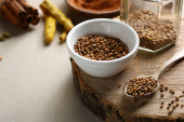 Nasiona kolendry organicznych w szklanym słoiku, widok z góry żywności