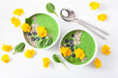 zielony szpinak smoothie bowl z jagodami, chia nasiona i jadalne kwiaty bratek