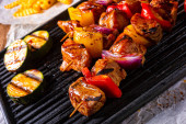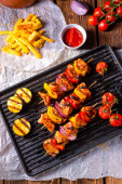 Rustickebab z mięsa marynowane, szynka, papryka i czerwonej cebuli na tacy