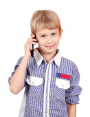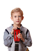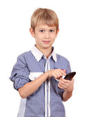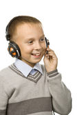 szczęśliwy chłopiec słuchania muzyki na inteligentny telefon