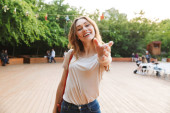 Zdjęcie "Zbliżenie na śmieszne młoda dziewczyna biorąc selfie z wyciągniętą ręką stojąc w parku" może być wykorzystywane do celów osobistych i komercyjnych zgodnie z warunkami zakupionej licencji Royalty-free. Obraz jest dostępny do pobrania w jakości wysokiej rozdzielczości do 5760x3840.