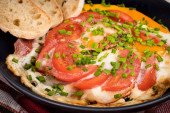 Zdjęcie "Domowe śniadania smażone jajko z pomidorami na drewnianym stole. Widok z góry." może być wykorzystywane do celów osobistych i komercyjnych zgodnie z warunkami zakupionej licencji Royalty-free. Obraz jest dostępny do pobrania w jakości wysokiej rozdzielczości do 5760x3840.