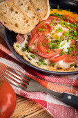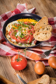 Domowe śniadania smażone jajko z pomidorami na drewnianym stole. Widok z góry.