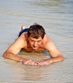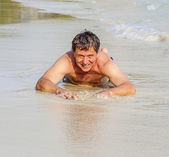 człowiek w bathingsuit jest leżąc na plaży i korzystających ze słoną wodą z małe fale i uśmiecha