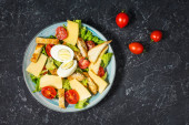 Sałatka z pomidorów i awokado na kamienne podłoże. Widok z góry