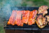 Różnorodnych mieszane grill z mięsa z kurczaka i wieprzowe, kiełbaski, pieczenia na ruszcie grilla gotowane na lato obiad rodzinny.