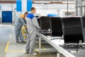 Mińsk, Białoruś - 08 maja 2018: warsztaty dla telewizorów montażowych