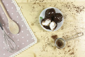 Tarta z krem czekoladowy na podłoże drewniane - widok z góry