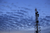 Telekomunikacyjnych wieży anteny i satelitarnej danie w tle niebo zachód słońca.