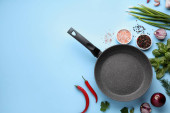 organiczne, świeże warzywa cukinia, pomidor, szparagi, bazylia, koperek, zielony groszek, czosnek na patelni