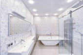 Zdjęcie "Nowoczesne wnętrza łazienki w nowym domu." może być wykorzystywane do celów osobistych i komercyjnych zgodnie z warunkami zakupionej licencji Royalty-free. Obraz jest dostępny do pobrania w jakości wysokiej rozdzielczości do 5760x3840.