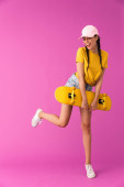 Młoda dziewczyna Azji nastoletnich na różowym tle. Stylowy, młoda kobieta z deskorolka na białym tle.