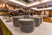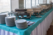 Zestaw naczyń dla uroczysty obiad przy stole bankietowym.