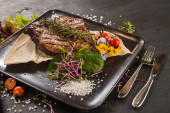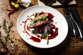 Grillowane mięso stek z sosem raspberrie na podłoże drewniane