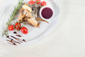 Grillowane mięso stek z sosem raspberrie na podłoże drewniane