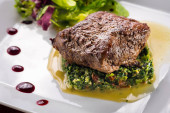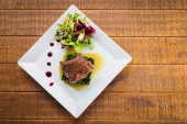 Smażony kawałek mięsa z dodatkiem ziół i przypraw na podłoże drewniane