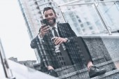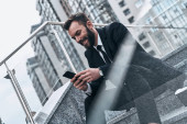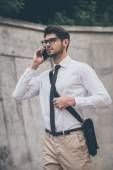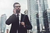 przystojny biznesmen w kolorze rozmowy na telefon stojąc na zewnątrz