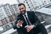 uśmiechający się biznesmen w pełny garnitur przeglądania telefonu komórkowego i siedzi na ulicy schody