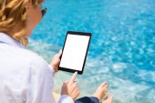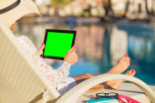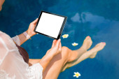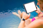 Kobieta czytająca online blog na tablet podczas kąpieli. Składa się cała zawartość.