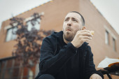 Młody Brodaty mężczyzna jedzenie burger i Zamknij uśmiechający się w górę.