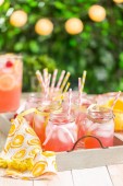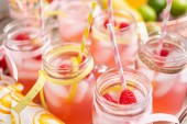 Lemoniada malinowa przyozdobionym z cytryny i maliny w picie mason słoiki.