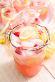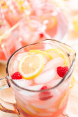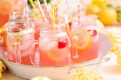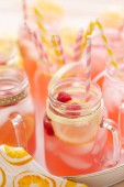 Lemoniada malinowa przyozdobionym z cytryny i maliny w picie mason słoiki.