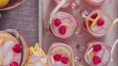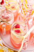 Lemoniada malinowa przyozdobionym z cytryny i maliny w picie mason słoiki.