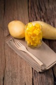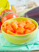 Kawałki owoców papai dojrzałe czarne miski na podłoże drewniane