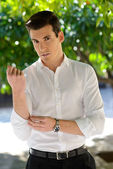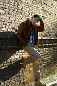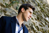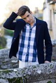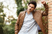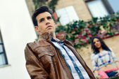 przystojny mężczyzna z nowoczesną fryzurę uśmiechający się w ośrodkach miejskich
