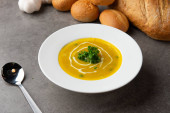 Zdjęcie "Zupa z dyni z przypraw na stole" może być wykorzystywane do celów osobistych i komercyjnych zgodnie z warunkami zakupionej licencji Royalty-free. Obraz jest dostępny do pobrania w jakości wysokiej rozdzielczości do 5760x3840.