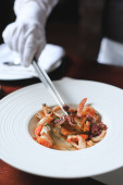 Penne makaron pomidor sosie arabiata z owocami morza na podłoże drewniane Styl vintage