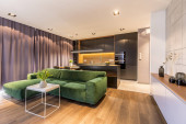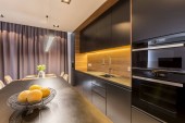 Czarna kuchnia ze światłem w nowoczesnym wnętrzu ciemne zasłony i kwiaty na stół