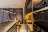 Prawdziwe zdjęcie metalowe miski z żółte owoce umieszczone na czarny blat w ciemnej kuchni nowoczesne wnętrze