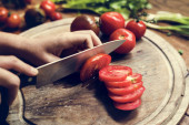 Zdjęcie "Zbliżenie ręki z nożem cięcie pomidorów" może być wykorzystywane do celów osobistych i komercyjnych zgodnie z warunkami zakupionej licencji Royalty-free. Obraz jest dostępny do pobrania w jakości wysokiej rozdzielczości do 5760x3840.