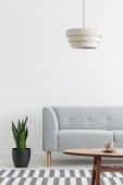 Brązowy sofa, poduszki, stolik i światła we wnętrzu salonu obok puste ściany i roślin. Miejsce na plakat lub meble