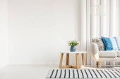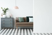 Prawdziwe zdjęcie komody, roślina, brązowy sofa i malarstwo w wnętrzu salonu z pustą ścianę z przodu gdzie można umieścić swój plakat