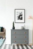 Zdjęcie "Prawdziwe zdjęcie komody, roślina, brązowy sofa i malarstwo w wnętrzu salonu z pustą ścianę z przodu gdzie można umieścić swój plakat" może być wykorzystywane do celów osobistych i komercyjnych zgodnie z warunkami zakupionej licencji Royalty-free. Obraz jest dostępny do pobrania w jakości wysokiej rozdzielczości do 5760x3840.