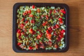 połowów błękitka pieczone z warzywa, pomidory, papryka i cebula na blachy do pieczenia, widok z góry zbliżenie