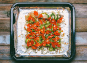 Zdjęcie "Kasza gryczana z dekoracji niebieskie ryby whiting pieczone z warzywami, pomidorów, papryki i cebuli na podłoże drewniane, widok z góry zbliżenie" może być wykorzystywane do celów osobistych i komercyjnych zgodnie z warunkami zakupionej licencji Royalty-free. Obraz jest dostępny do pobrania w jakości wysokiej rozdzielczości do 5760x3840.